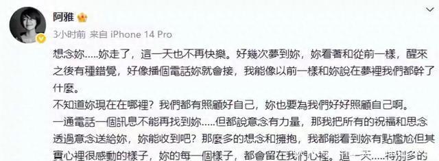 “好几次梦到你,看着和从前一样,醒来后有种错觉,好像拨个电话你就会接。” 她提到试图用“意念”传递祝福,因为一通电话再也找不到对方。 这段文字与娱乐圈的静默形成尖锐对比,却恰恰印证了阿雅与大S情谊的深度。